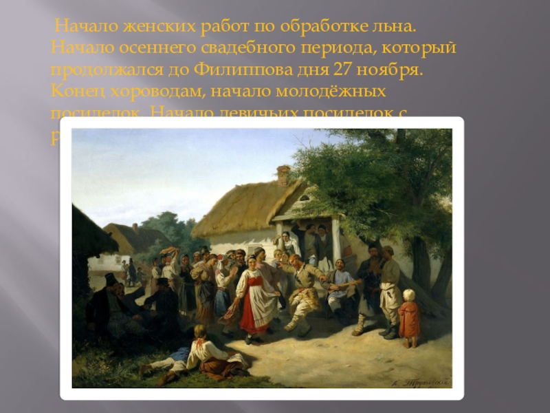 Начало женских работ по обработке льна. Начало осеннего свадебного периода, который продолжался до Филиппова дня 27
