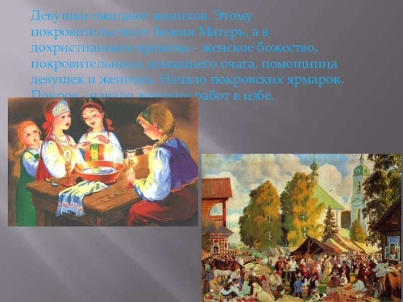 Слайд 8Девушки ожидают женихов. Этому покровительствует Божия Матерь, а в дохристианские времена
