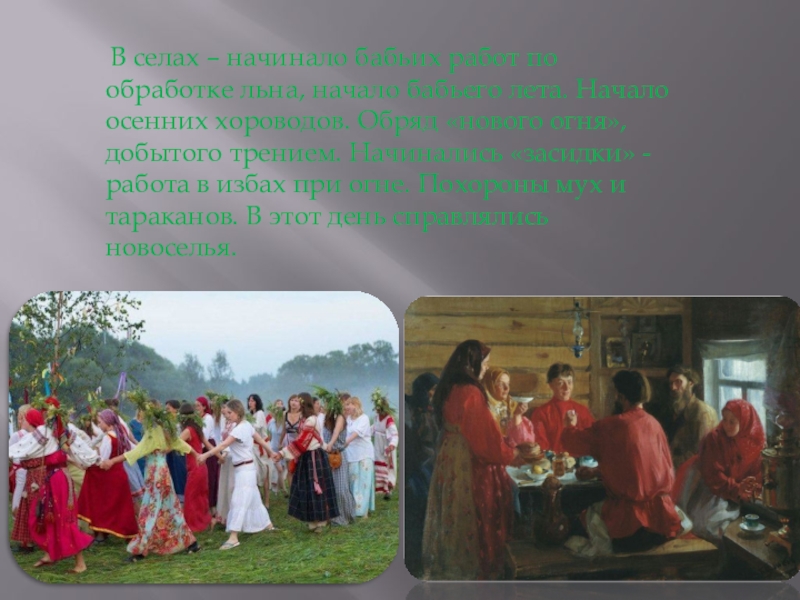 бабьего лета. Начало осенних хороводов. Обряд «нового огня», добытого трением. Начинались «засидки» - работа в избах при огне. Похороны мух и тараканов. В этот день справлялись новоселья.