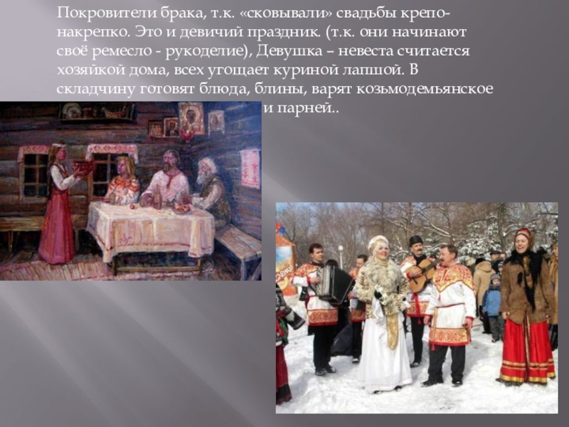 Слайд 10Покровители брака, т.к. «сковывали» свадьбы крепо-накрепко. Это и девичий праздник. (т.к.