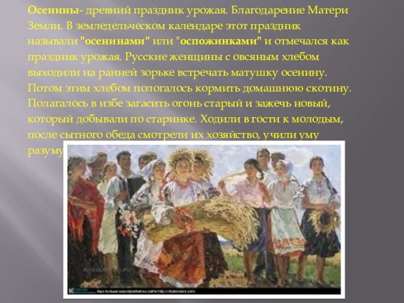 Слайд 5Осенины- древний праздник урожая. Благодарение Матери Земли. В земледельческом календаре этот