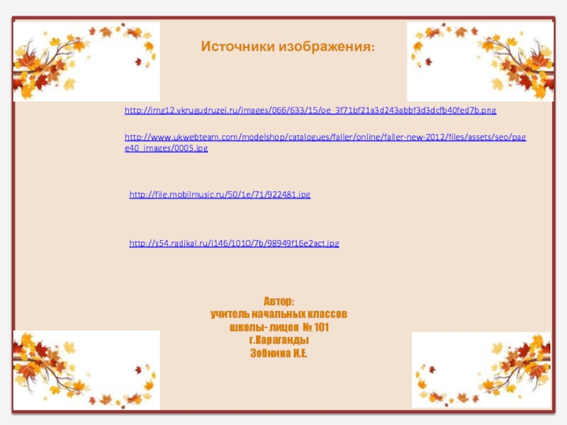 http://img12.vkrugudruzei.ru/images/066/633/15/oe_3f71bf21a3d243abbf3d3dcfb40fed7b.pnghttp://www.ukwebteam.com/modelshop/catalogues/faller/online/faller-new-2012/files/assets/seo/page40_images/0005.jpghttp://file.mobilmusic.ru/50/1e/71/922481.jpghttp://s54.radikal.ru/i146/1010/7b/98949f16e2act.jpgИсточники изображения:Автор:учитель начальных классовшколы- лицея № 101г.КарагандыЗобнина И.Е.