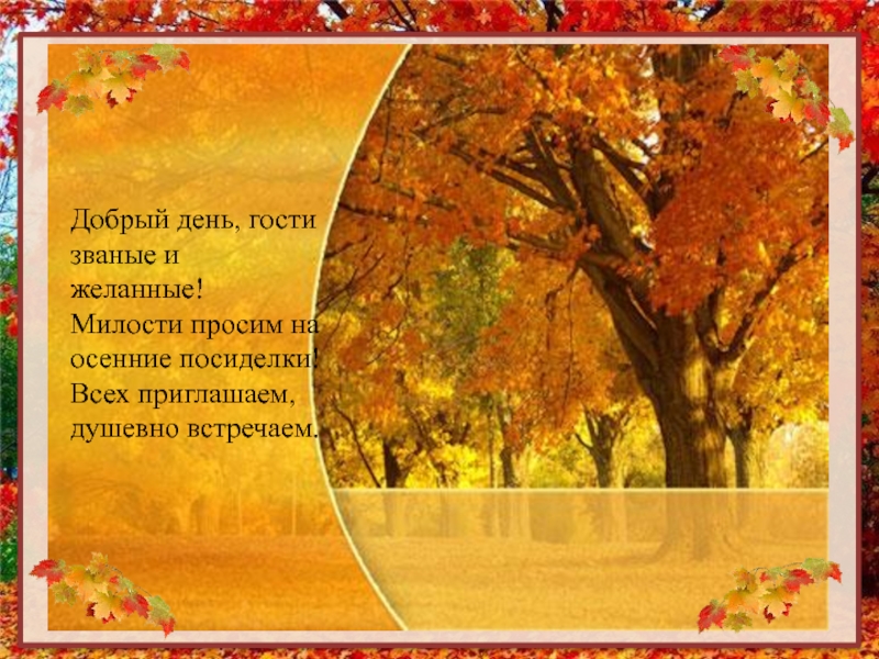 Слайд 2Добрый день, гости званые и желанные! Милости просим на осенние посиделки! Всех приглашаем,
