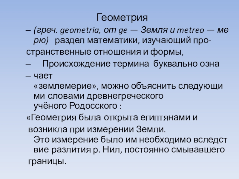 Геометрия(греч. geometria, от ge — Земля и metreo — мерю)   раздел математики, изучающий про-странственные отношения и формы,     Происхождение термина  буквально означает«землемерие», можно объяснить следующими словами древнегреческого учёного Родосского : «Геометрия была открыта египтянами и возникла при измерении Земли. Это измерение было им необходимо вследствие разлития р. Нил, постоянно смывавшего границы.