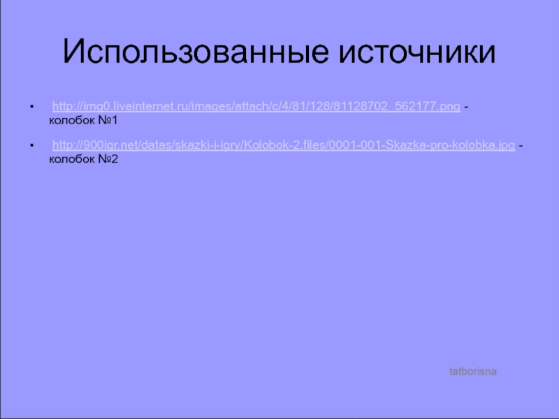 Использованные источники http://img0.liveinternet.ru/images/attach/c/4/81/128/81128702_562177.png -    колобок №1 http://900igr.net/datas/skazki-i-igry/Kolobok-2.files/0001-001-Skazka-pro-kolobka.jpg - колобок №2