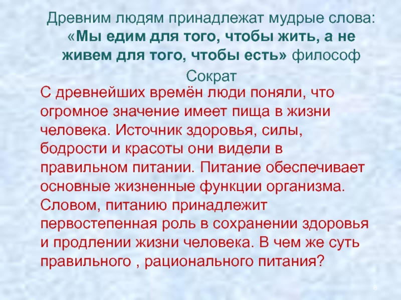 С древнейших времён люди поняли, что огромное значение имеет пища в жизни человека. Источник здоровья, силы, бодрости и красоты они видели в правильном питании. Питание обеспечивает основные жизненные функции организма. Словом, питанию принадлежит первостепенная роль в сохранении здоровья и продлении жизни человека. В чем же суть правильного , рационального питания?
