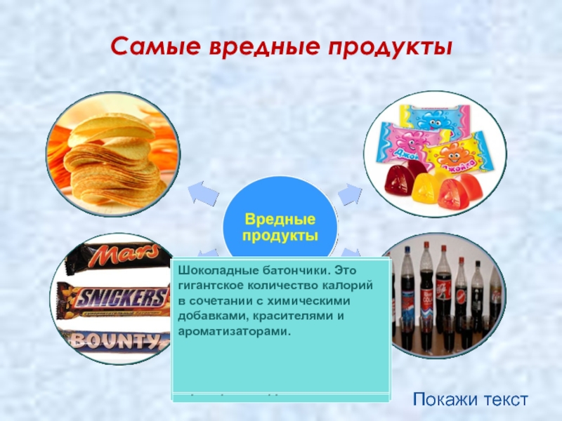 Шоколадные батончики. Это гигантское количество калорий в сочетании с химическими добавками, красителями и ароматизаторами.