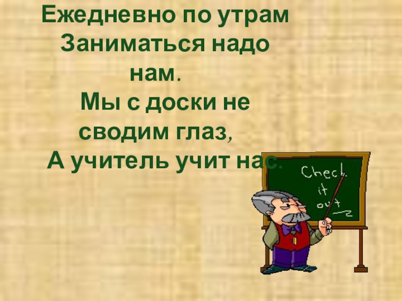 Ежедневно по утрам Заниматься надо нам.Мы с доски не сводим глаз,А учитель учит нас.