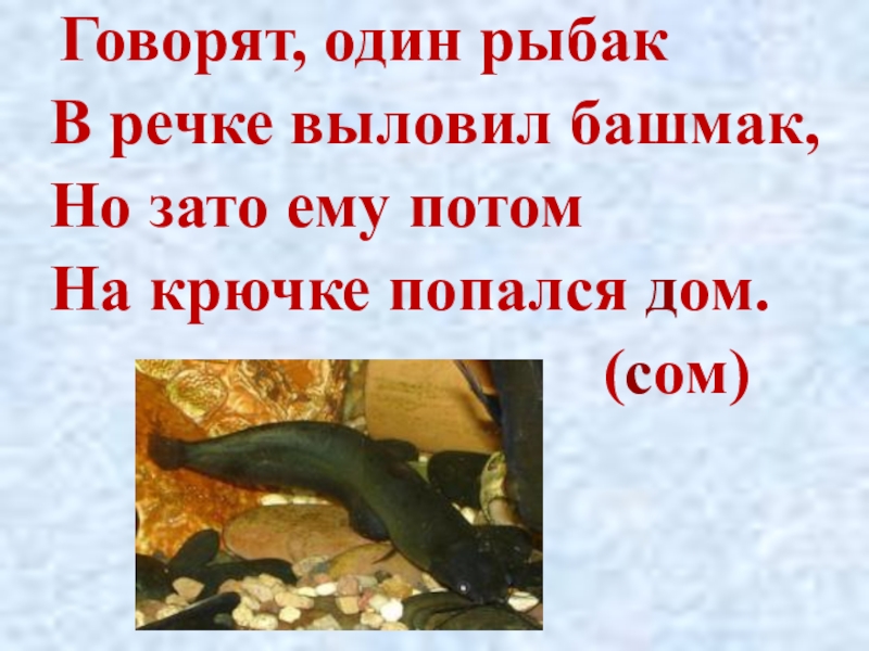 Говорят, один рыбакВ речке выловил башмак,Но зато ему потомНа крючке попался дом.