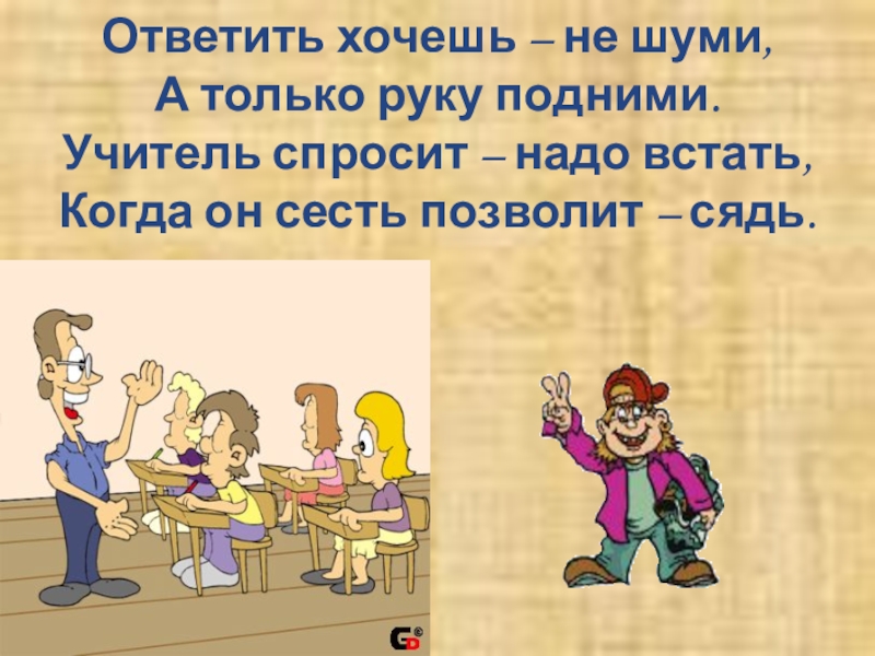 Ответить хочешь – не шуми,А только руку подними.Учитель спросит – надо встать,Когда он сесть позволит – сядь.