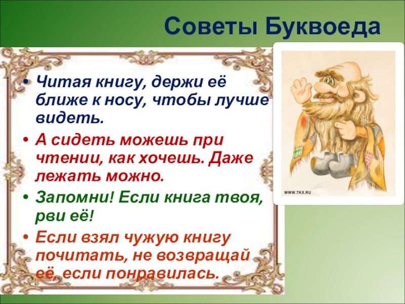 Советы БуквоедаЧитая книгу, держи её ближе к носу, чтобы лучше видеть.А сидеть можешь при чтении, как хочешь.