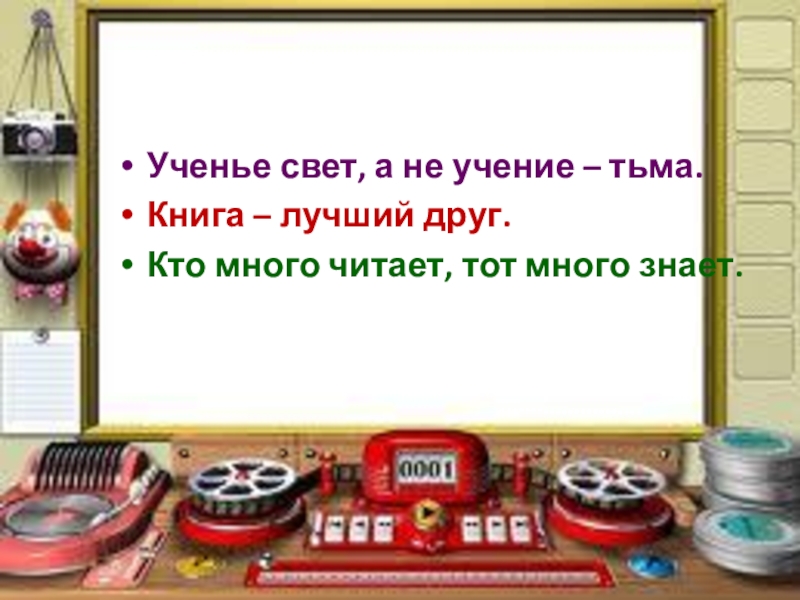Ученье свет, а не учение – тьма.Книга – лучший друг.Кто много читает, тот много знает.