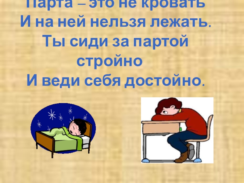 Парта – это не кроватьИ на ней нельзя лежать.Ты сиди за партой стройноИ веди себя достойно.