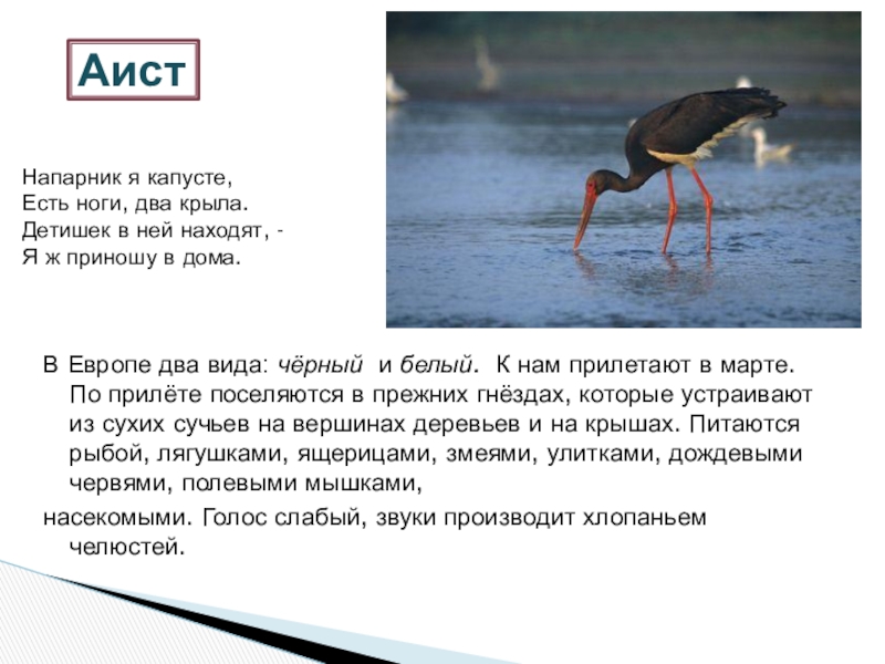 Слайд 12В Европе два вида: чёрный и белый. К нам прилетают в марте. По прилёте поселяются