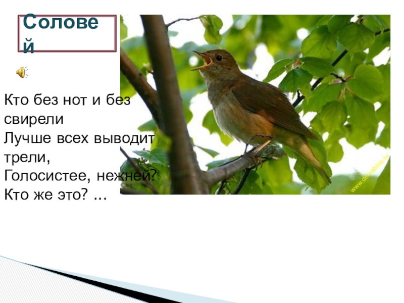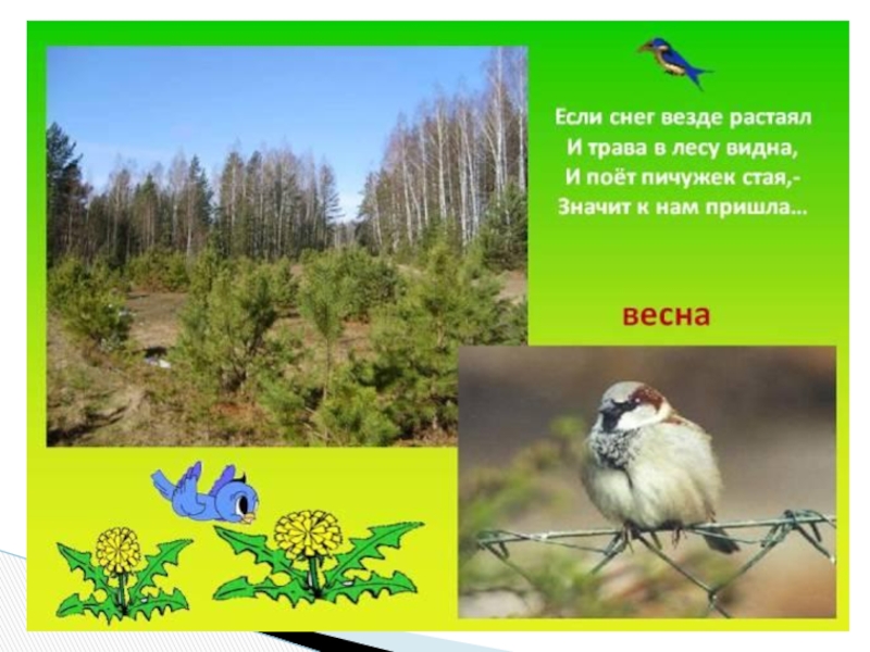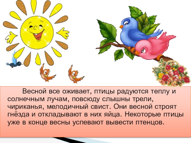и солнечным лучам, повсюду слышны трели, чириканья, мелодичный свист. Они весной строят гнёзда и откладывают в них яйца. Некоторые птицы уже в конце весны успевают вывести птенцов.