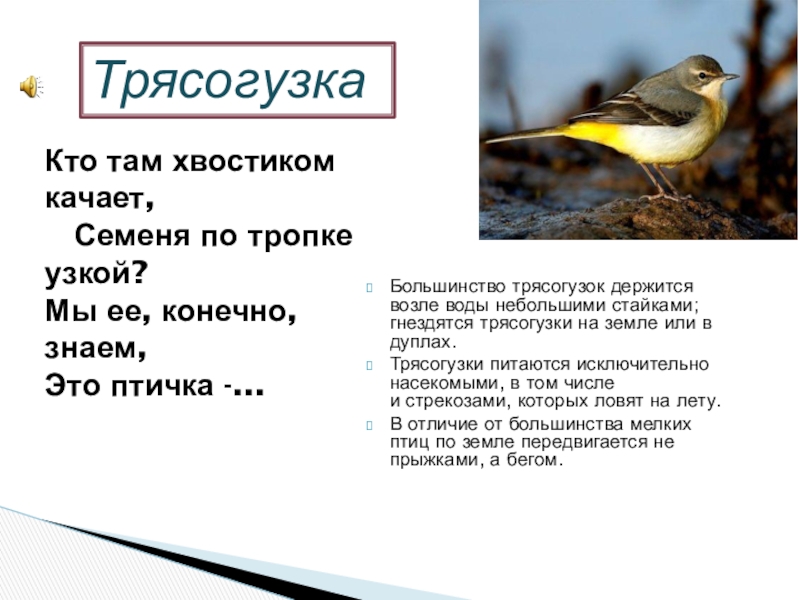 Слайд 17Большинство трясогузок держится возле воды небольшими стайками; гнездятся трясогузки на земле