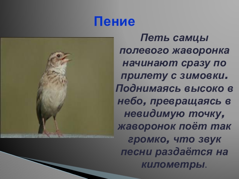 Петь самцы полевого жаворонка начинают сразу по прилету с зимовки. Поднимаясь