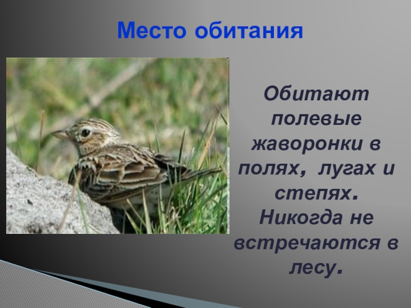 Слайд 33Обитают полевые жаворонки в полях, лугах и степях. Никогда не встречаются
