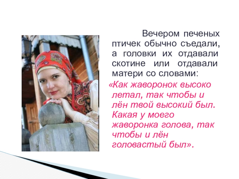 «Как жаворонок высоко летал, так чтобы и лён твой высокий был. Какая у моего жаворонка голова, так чтобы и лён головастый был».