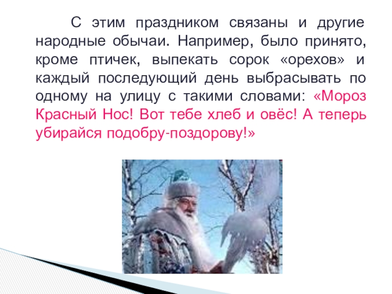 Например, было принято, кроме птичек, выпекать сорок «орехов» и каждый последующий день выбрасывать по одному на улицу с такими словами: «Мороз Красный Нос! Вот тебе хлеб и овёс! А теперь убирайся подобру-поздорову!»