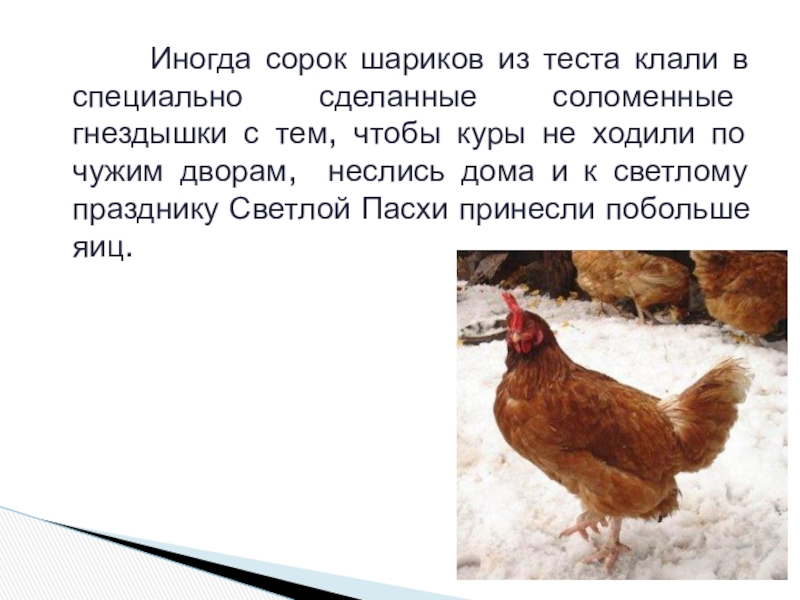 специально сделанные соломенные гнездышки с тем, чтобы куры не ходили по чужим дворам, неслись дома и к светлому празднику Светлой Пасхи принесли побольше яиц.