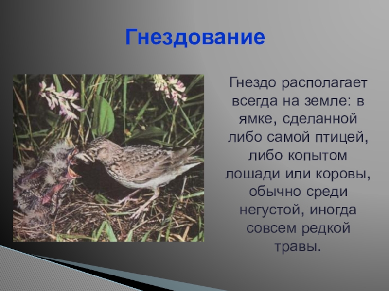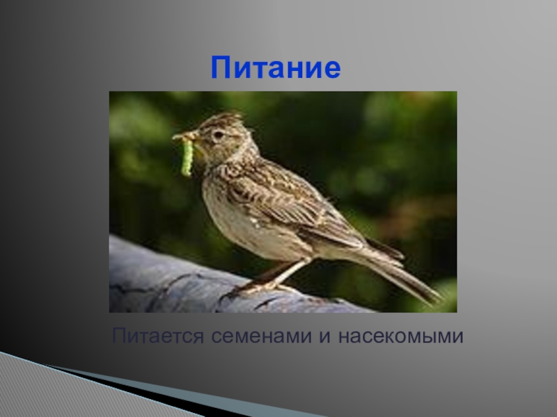 Слайд 31Полевой жаворонок размером немного крупнее воробья и имеет неяркую, но привлекательную