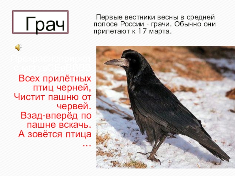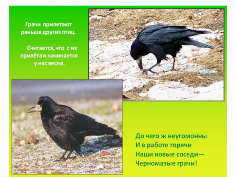 Слайд 8 Первые вестники весны в средней полосе России - грачи.