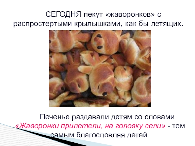 Слайд 38 СЕГОДНЯ пекут «жаворонков» с распростертыми крылышками, как бы летящих.