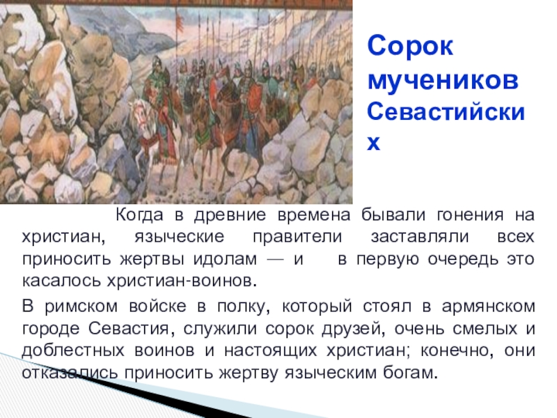 В римском войске в полку, который стоял в армянском городе Севастия, служили сорок друзей, очень смелых и доблестных воинов и настоящих христиан; конечно, они отказались приносить жертву языческим богам.