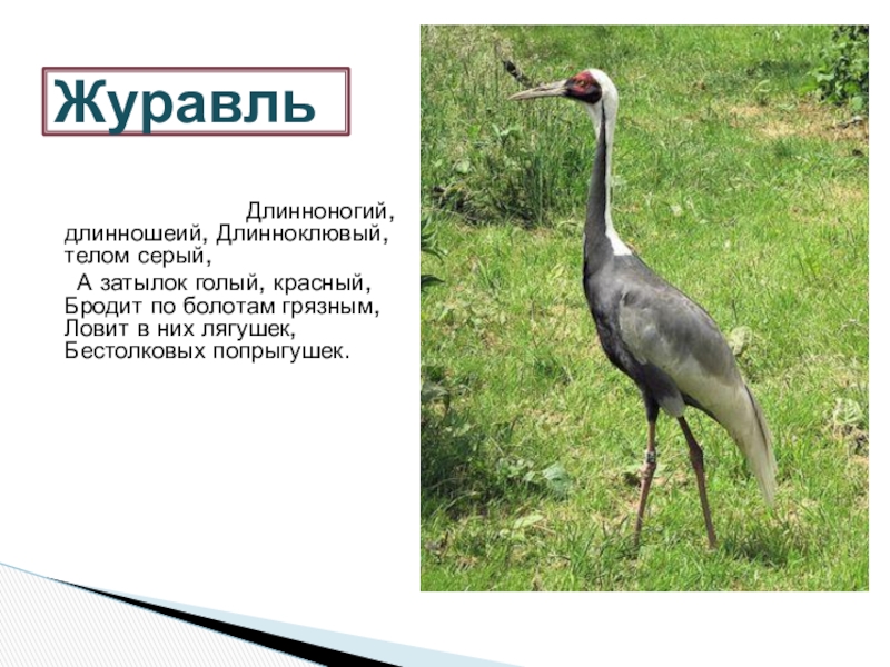 Слайд 15 Род птиц семейства настоящих журавлей, обитающих в Европе, Азии, Длинноногий, длинношеий, Длинноклювый,