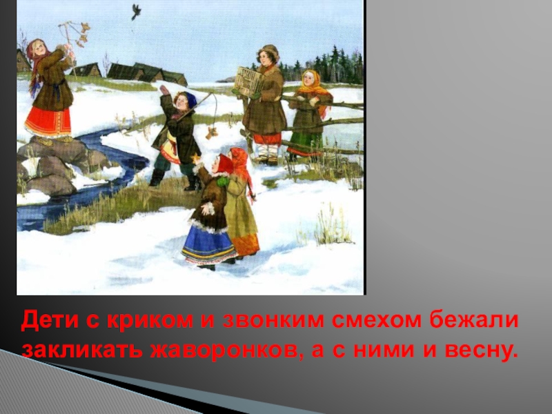 Слайд 39Дети с криком и звонким смехом бежали закликать жаворонков, а с