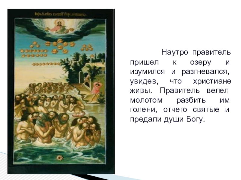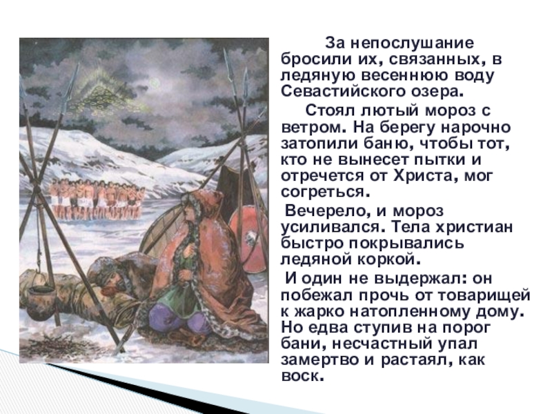 Стоял лютый мороз с ветром. На берегу нарочно затопили баню, чтобы тот, кто не вынесет пытки и отречется от Христа, мог согреться.