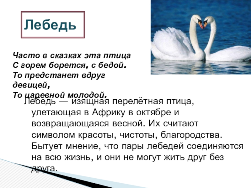 Слайд 18Лебедь — изящная перелётная птица, улетающая в Африку в октябре и