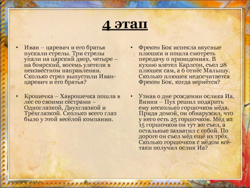 Узнав о дне рождении ослика Иа, Винни – Пух решил подарить ему несколько горшочков мёда. Придя домой, он обнаружил, что у него есть 25 горшочков. Мёд из 15 горшочков он тут же съел, а остальные захватил с собой. По дороге он съел мёд ещё их трёх. Сколько горшочков с мёдом всё-таки получил ослик Иа?