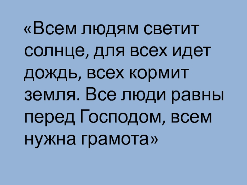 «Всем людям светит солнце, для всех идет дождь, всех кормит земля. Все люди равны перед Господом, всем нужна грамота»