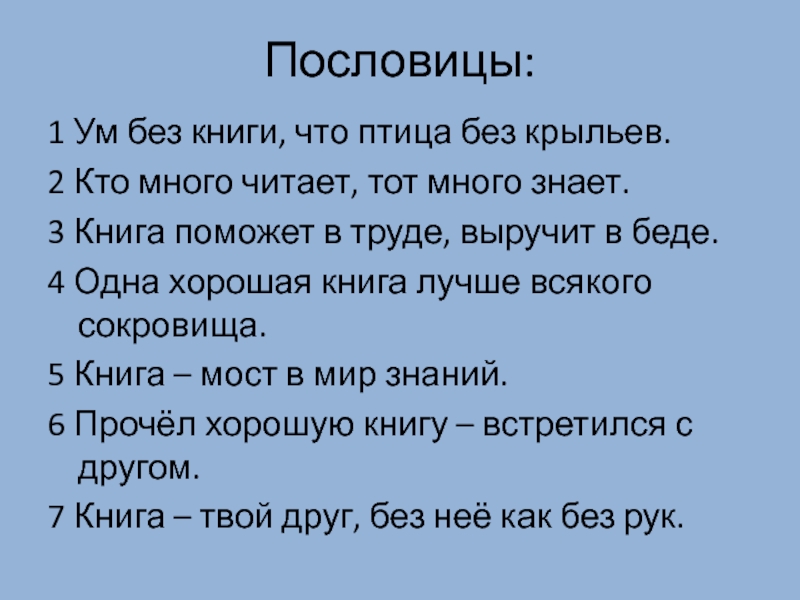 Пословицы:1 Ум без книги, что птица без крыльев.2 Кто много читает, тот много знает.3 Книга поможет в