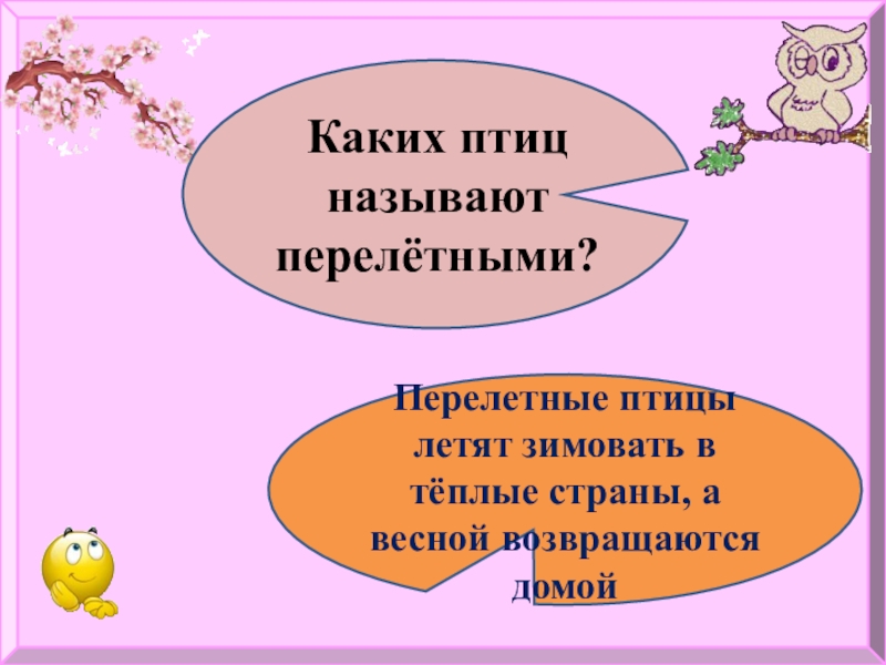 Каких птиц называют перелётными?Перелетные птицы летят зимовать в тёплые страны, а весной возвращаются домой