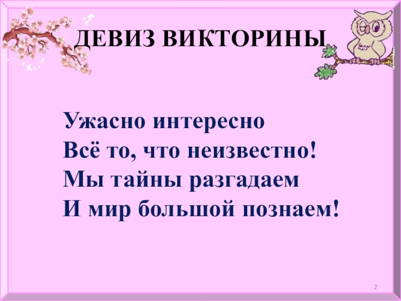 ДЕВИЗ ВИКТОРИНЫУжасно интересноВсё то, что неизвестно!Мы тайны разгадаемИ мир большой познаем!