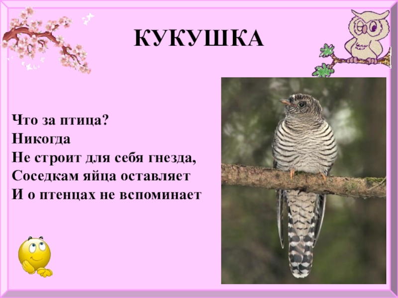 КУКУШКАЧто за птица?  Никогда  Не строит для себя гнезда,  Соседкам яйца оставляет  И о птенцах не вспоминает