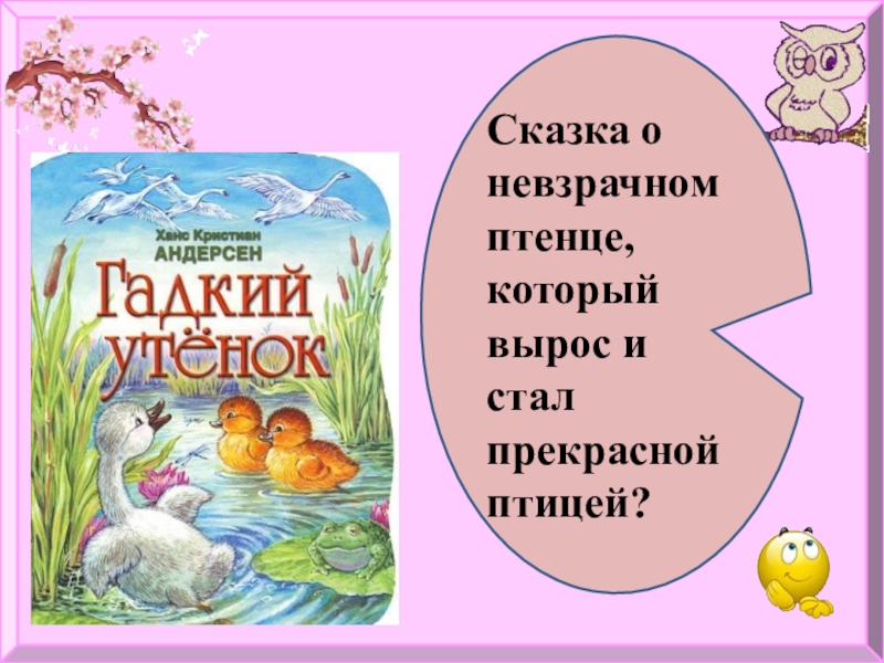 Слайд 14Сказка о невзрачном птенце, который вырос и стал прекрасной птицей?