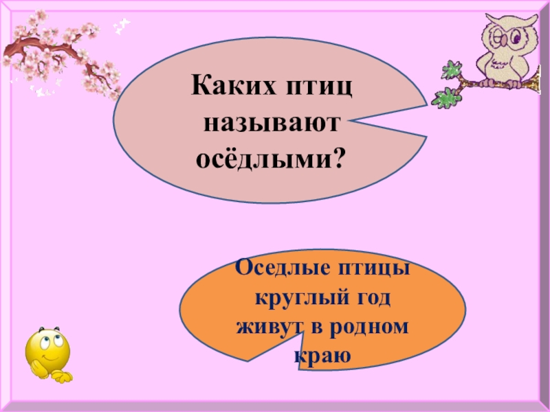 Каких птиц называют осёдлыми?Оседлые птицы круглый год живут в родном краю