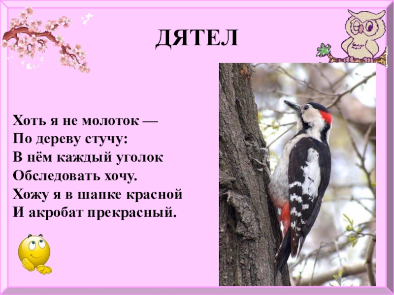Хоть я не молоток — По дереву стучу: В нём каждый уголок Обследовать хочу. Хожу