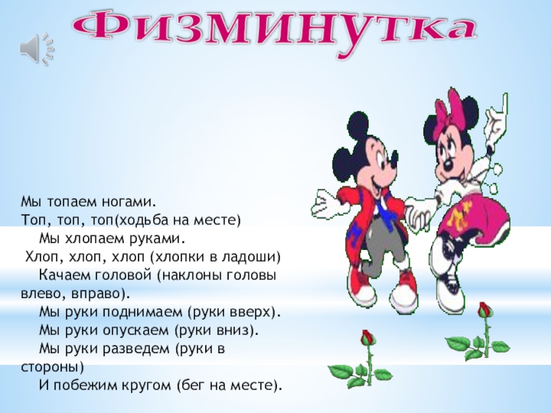 Мы топаем ногами. Топ, топ, топ(ходьба на месте)    Мы хлопаем руками. Хлоп, хлоп, хлоп (хлопки в ладоши)    Качаем головой
