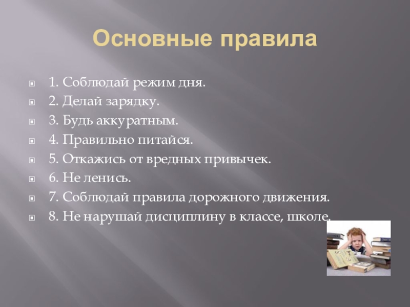 Основные правила1. Соблюдай режим дня.2. Делай зарядку.3. Будь аккуратным.4. Правильно питайся.5. Откажись от вредных привычек.6. Не ленись.7. Соблюдай правила дорожного движения.8. Не нарушай дисциплину в классе, школе.
