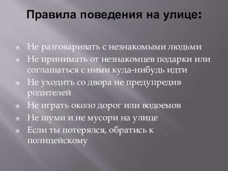 Правила поведения на улице: Не разговаривать с незнакомыми людьмиНе принимать от незнакомцев подарки или соглашаться с ними
