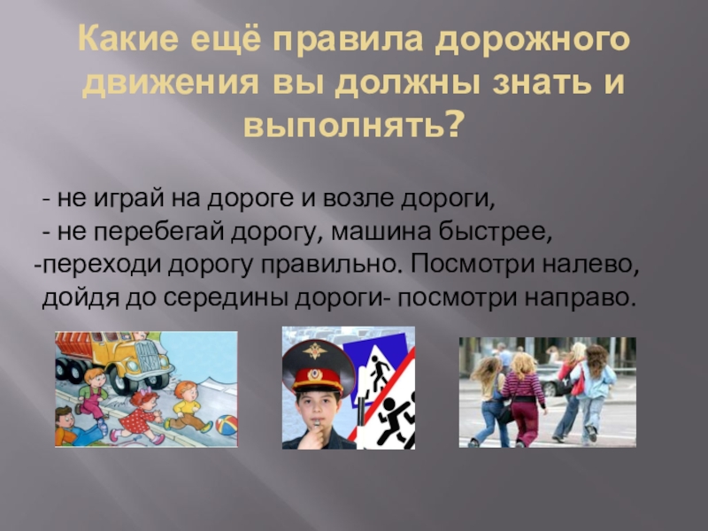 Какие ещё правила дорожного движения вы должны знать и выполнять? - не играй на дороге и возле