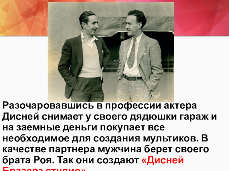 на заемные деньги покупает все необходимое для создания мультиков. В качестве партнера мужчина берет своего брата Роя. Так они создают «Дисней Бразерз студио».
