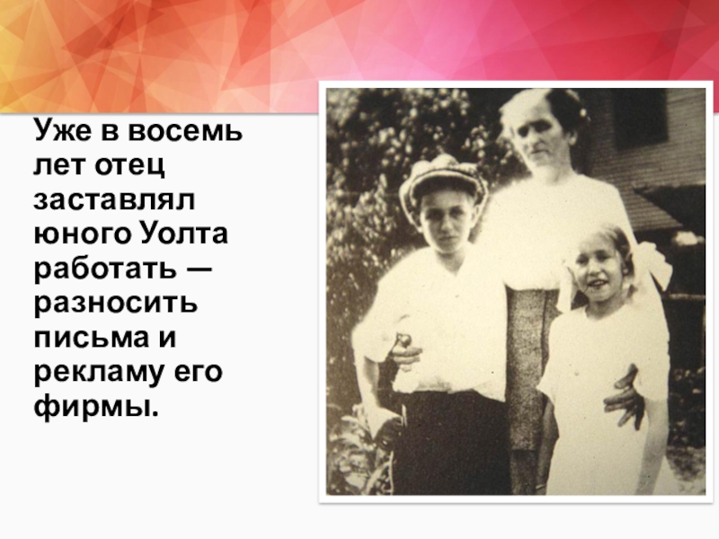 Слайд 4Уже в восемь лет отец заставлял юного Уолта работать — разносить