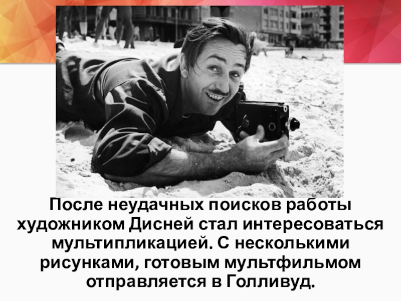 После неудачных поисков работы художником Дисней стал интересоваться мультипликацией. С несколькими рисунками, готовым мультфильмом отправляется в Голливуд.