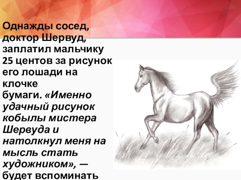 Однажды сосед, доктор Шервуд, заплатил мальчику 25 центов за рисунок его лошади на клочке бумаги. «Именно удачный рисунок